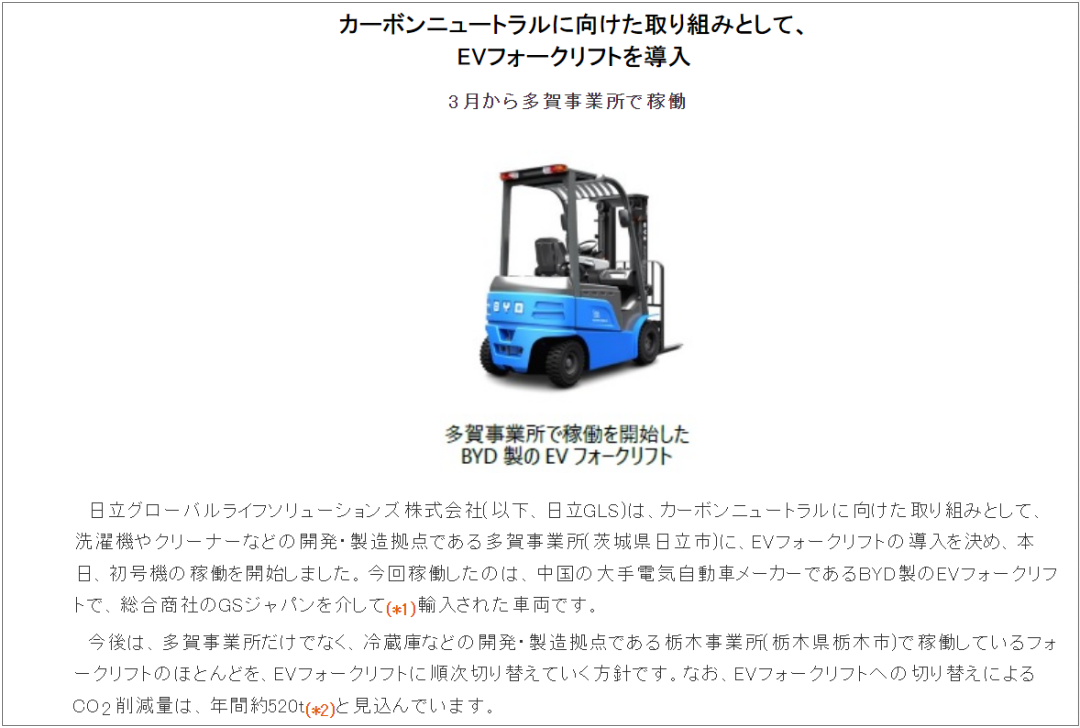 Hitachi GLS, a home appliance company under the Hitachi Group, imported the first BYD forklift, and started operations at the Hitachi GLS Taga Plant (Hitachi City, Ibaraki Prefecture) on March 1.