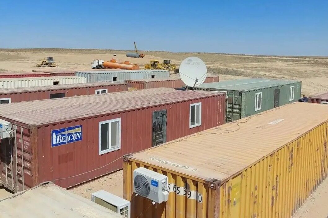 哈萨克斯坦克孜拉尔达通往热兹卡兹甘的公路,穿越了近五百公里的戈壁滩无人区,这里有一座彩色保温板房营地,在一个写有应急救援补给站字样的房间里,一群人正在忙碌。
