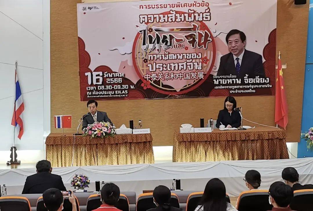 قدم السفير هان مقدمة شاملة لوضع التنمية في الصين والعلاقات بين الصين وتايلاند للمسؤولين الحكوميين في البلدين ، وأساتذة الجامعات والطلاب والصينيين المغتربين. تحديث الأسلوب: ستلتزم الصين بطريق التنمية السلمية ، وتوسع الانفتاح بثبات ، وتلتزم بتحقيق التنمية والازدهار المشتركين مع جميع دول العالم ، وخاصة الدول المجاورة. وأشار السفير هان إلى أن الرئيس شي جين بينغ سيقوم بزيارة تاريخية لتايلاند في عام 2022. واتفق الجانبان على بناء مجتمع صيني وتايلاند أكثر استقرارًا وازدهارًا واستدامة مع مستقبل مشترك والدخول في حقبة جديدة من العلاقات الثنائية.