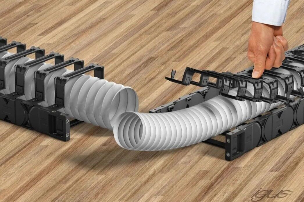 考虑到一些客户有使用拖链引导大尺寸软管的需求,igus现在为E4Q拖链新增了拓展横杆的设计。拓展横杆安装在拖链侧板上并与标准横杆组合使用形成一个适配系统。E4Q系列的拓展横杆无需任何工具即可轻松开合,这使用户可以根据软管直径更加灵活地调整拓展横杆。除了软管,其他电缆也可以一样排布。通过专为电缆设计的内部分隔片,用户可根据需要灵活地划分拖链内部空间并排布电缆和软管。