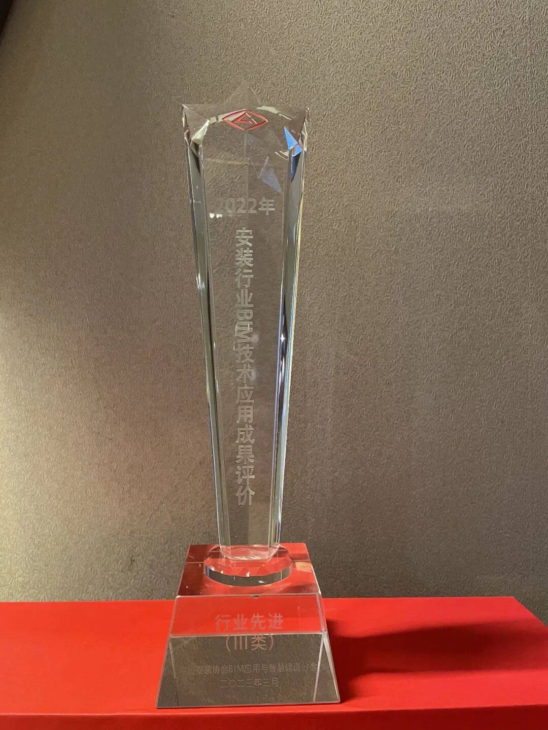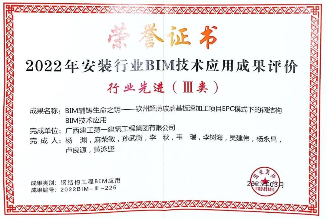 2023年3月23日,中国安装协会在杭州市举办团体标准《数据中心机电工程技术规程》发布宣贯会、BIM技术应用交流研讨会暨现场观摩会,对2022年安装行业BIM技术应用成果评价活动中的优秀成果完成单位和主要完成人颁发奖杯和荣誉证书,其中广西建工一建集团选送的成果《BIM辅铸生命之钥——钦州超薄玻璃基板深加工项目EPC模式下的钢结构BIM技术应用》获得行业先进。