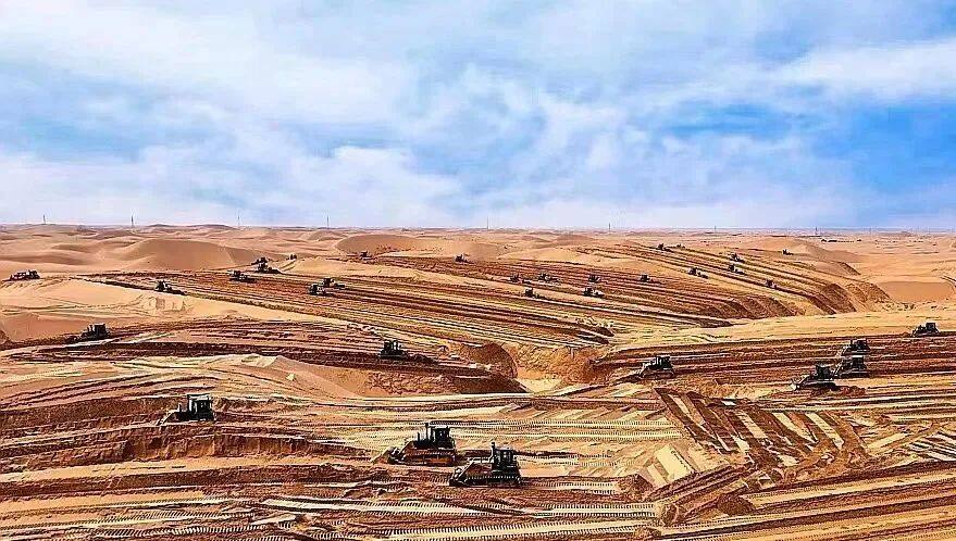 而如今,这条“恶龙”正在被套上闪亮的“光伏枷锁”—— 中国首个开工建设的千万千瓦级新能源大基地项目,同时也是全球最大规模风电光伏基地正在戈壁之上拔地而起,而由上百台山推推土机组成的“钢铁之师”正是先导工程场地平整作业的主力担当,如钢铁骏马般奔驰在天地之间,为这片不毛之地带来翻天覆地的巨变。
