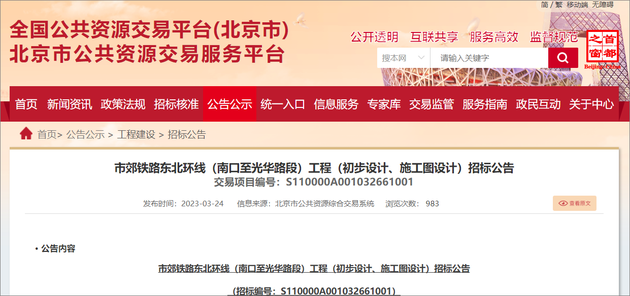 2023年3月24日,北京市公共资源交易中心发布了北京市郊铁路东北环线南口至光华路段工程初步设计、施工图设计招标公告,该项目所属行业铁路,招标人北京市域铁路融合发展集团有限公司,项目总投资219.94亿元。