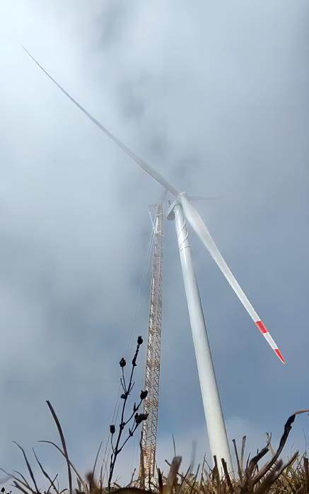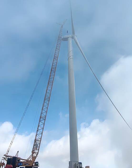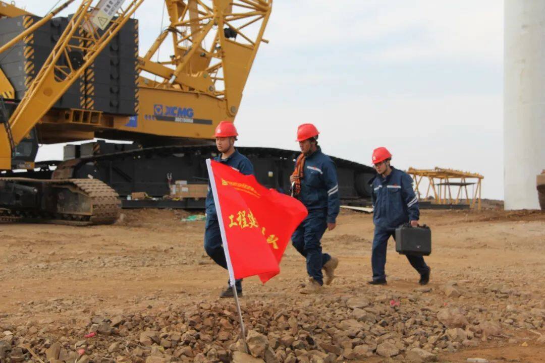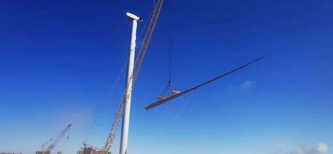 该项目轮毂中心距地高度110米、单支叶片长度94.5米,当前正值风季,要在百米高空吊装上百吨的设备,工程建设面临难度大、吊装条件苛刻和有效施工窗口期极短等重重困难。风一大,雾一大,危险就大了,我们必须要精准抓住每天仅有的小风时段,按计划确保安全高效的完成各项工作。该项目负责人表示。为确保吊装任务顺利完成,该事业部高度重视、周密部署,多措并举,成立专班指定专人,全力保障各施工环节有效对接。因时因势解锁单叶片吊装方案,迎风面更小极大程度避免了侧向载荷超出吊车的抗侧向能力,高效顺利完成首台风机吊装。