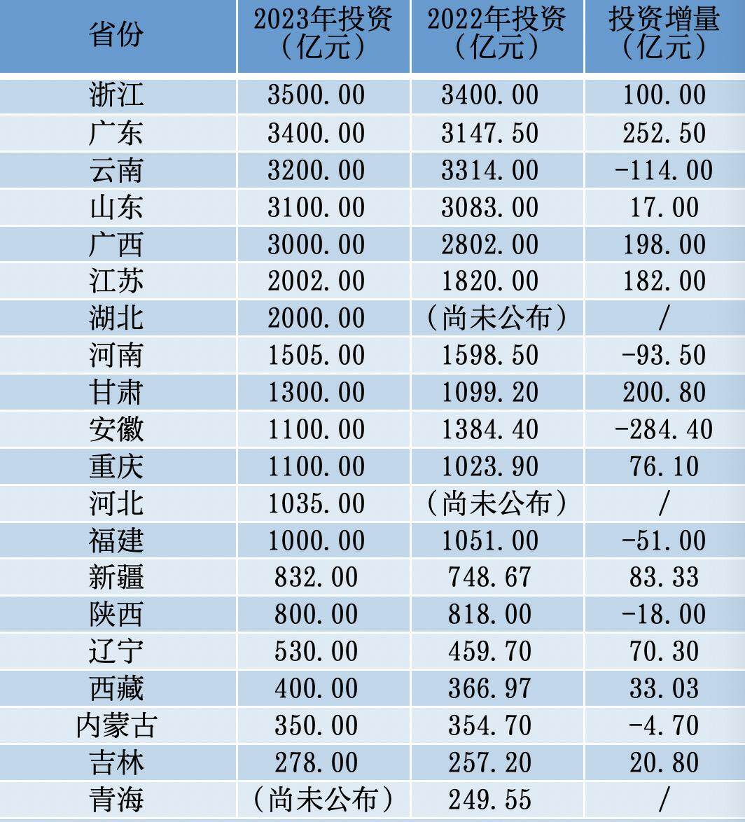 其中,在已公布的数据中,有5个省份的2023年预期投资超3000亿元,4个省份的2022年实际投资超3000亿元。