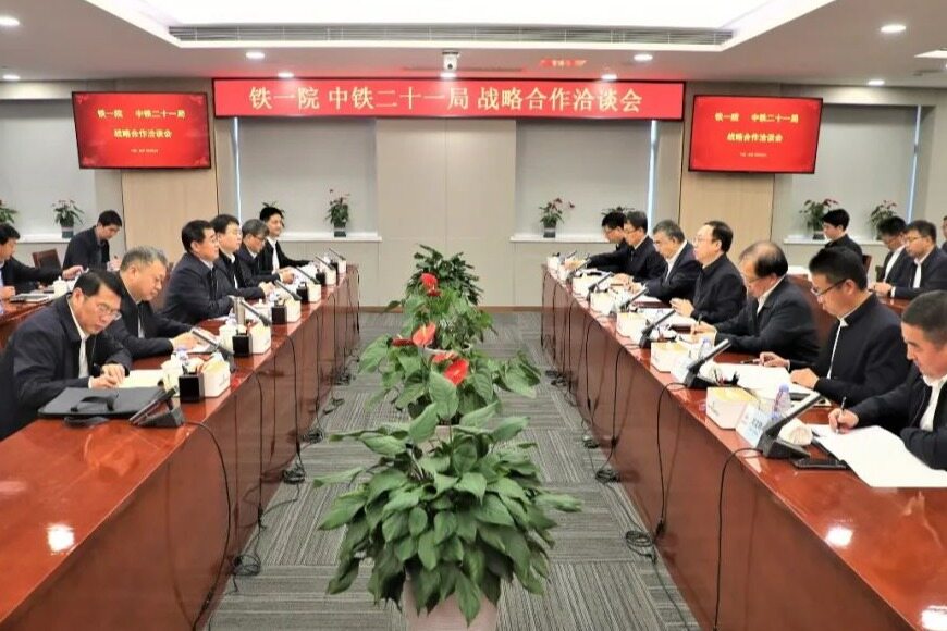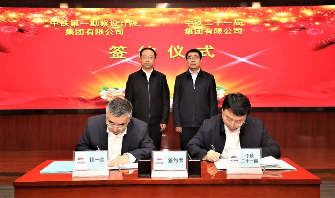 2023年3月27日下午,铁一院与中铁二十一局在西安签订战略合作协议。铁一院党委书记、董事长黄超,中铁二十一局党委书记、董事长庄纪栋共同见证协议签署。铁一院院长、党委副书记张浩与中铁二十一局总经理、党委副书记李冰分别代表双方签订协议。协议签署前,双方就全方位深化合作进行了深入交流,并达成共识。
