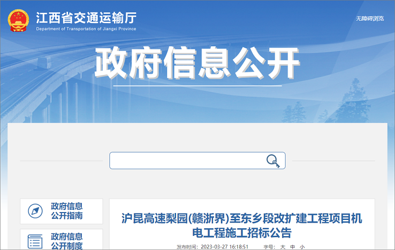 2023年3月27日,江西省交通运输厅发布了沪昆高速梨园(赣浙界)至东乡段改扩建工程项目机电工程施工招标公告,该项目机电工程计划工期33个月,保修期60个月。