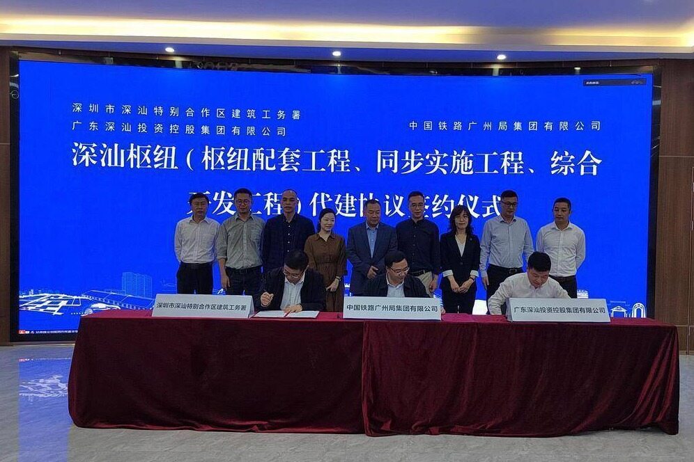 2023年3月24日,深圳市深汕特别合作区建筑工务署、深汕投控集团公司会同中国铁路广州局集团有限公司在广州签订深汕枢纽同步实施工程、枢纽配套工程和综合开发工程代建协议,全面委托广铁集团代建,标志着这座站城高度融合一体化开发项目取得重大进展,进入全面开发建设的快车道。