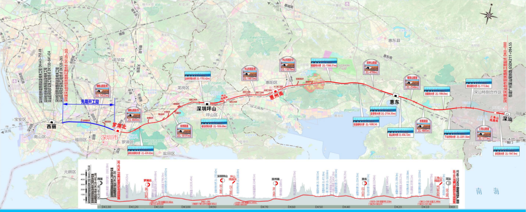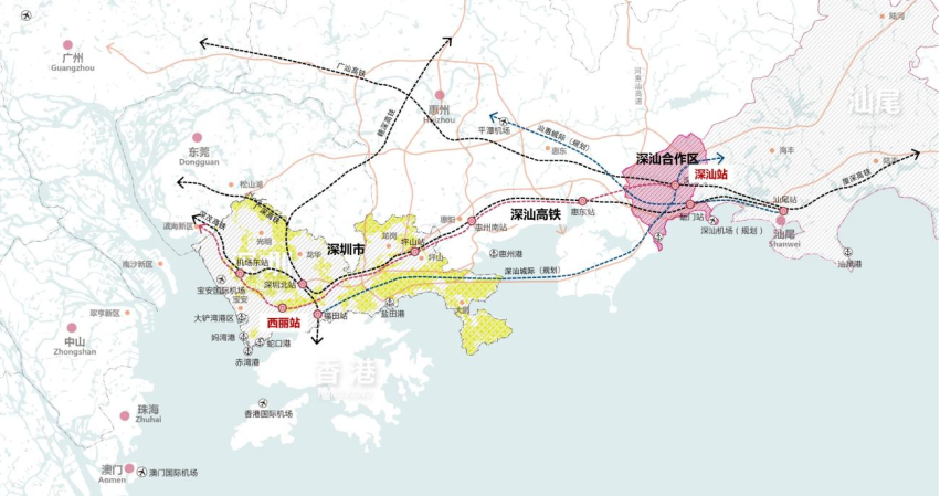 按照规划,深汕站引入的深汕铁路,设计速度为350公里/小时,全线设西丽、罗湖北、坪山、惠州南、惠东、深汕6座车站,串起深圳都市圈内深惠汕三地。