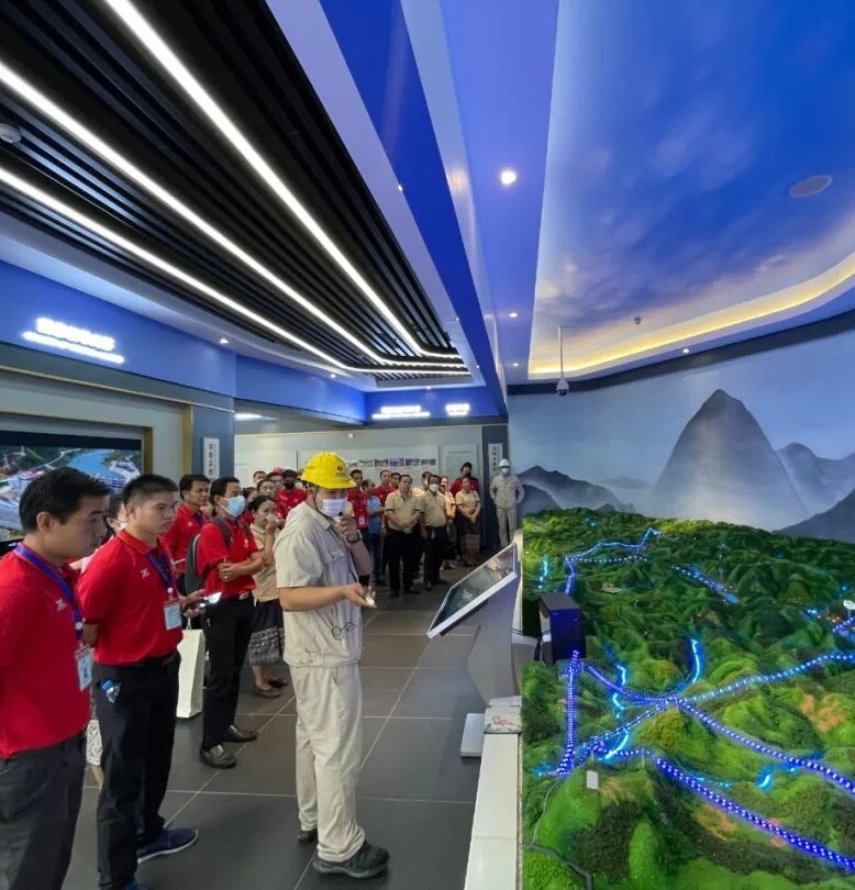 老挝籍电建员工纳塔蓬站在南欧江一级电站展厅,给80多位老挝苏发努冯大学参观师生讲解。他说:南欧江项目是中老两国领导人见证签约的一带一路重大基建工程。作为老挝人,我希望自己的青春因在中国电建工作而无悔。