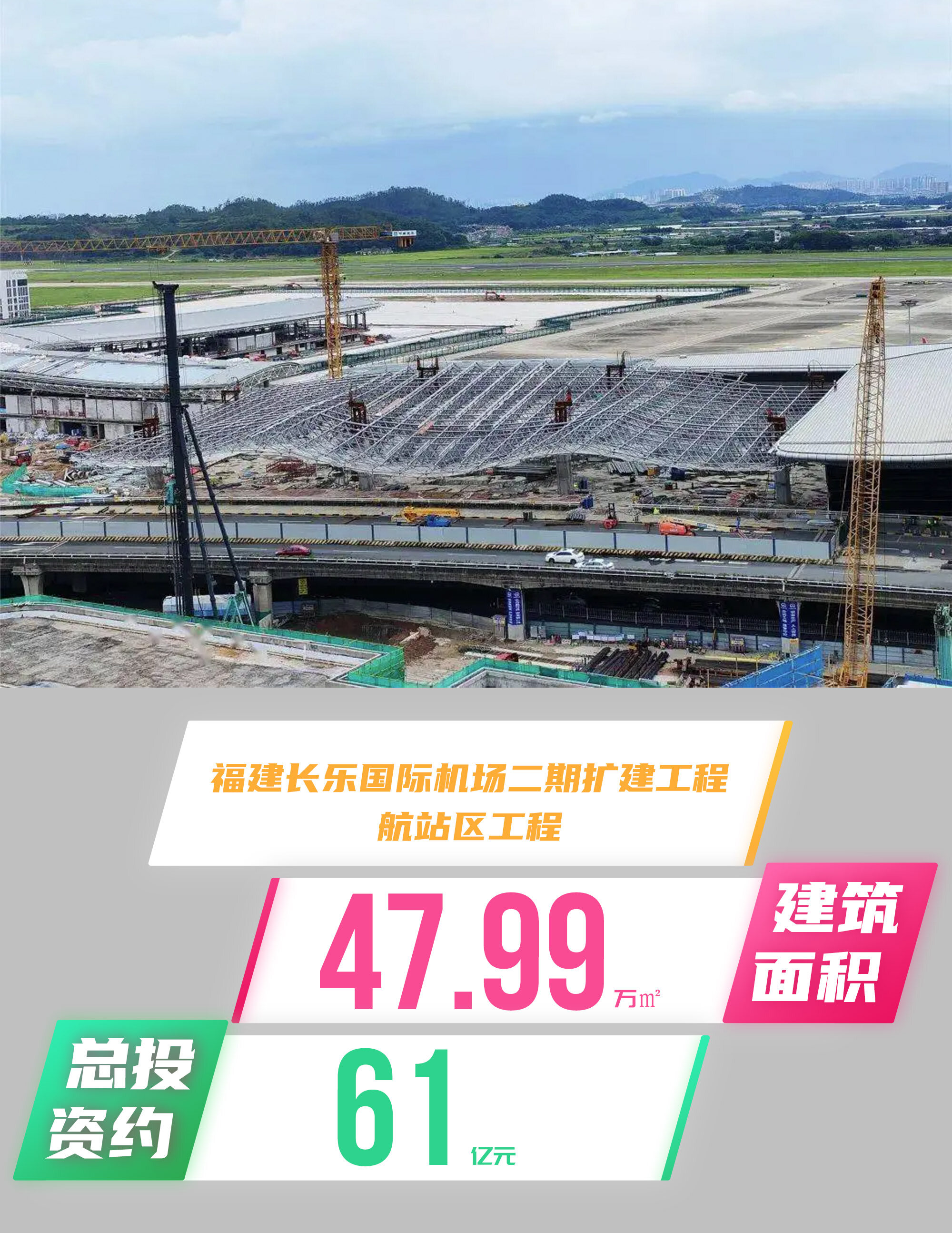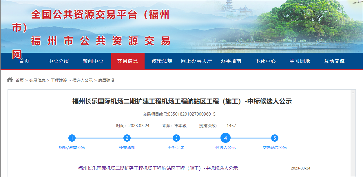 2023年3月24日,福州公共资源交易网发布福州长乐国际机场二期扩建工程机场工程航站区工程施工中标候选人公示,该项目由中建八局联合体中标,项目总工期1095天。