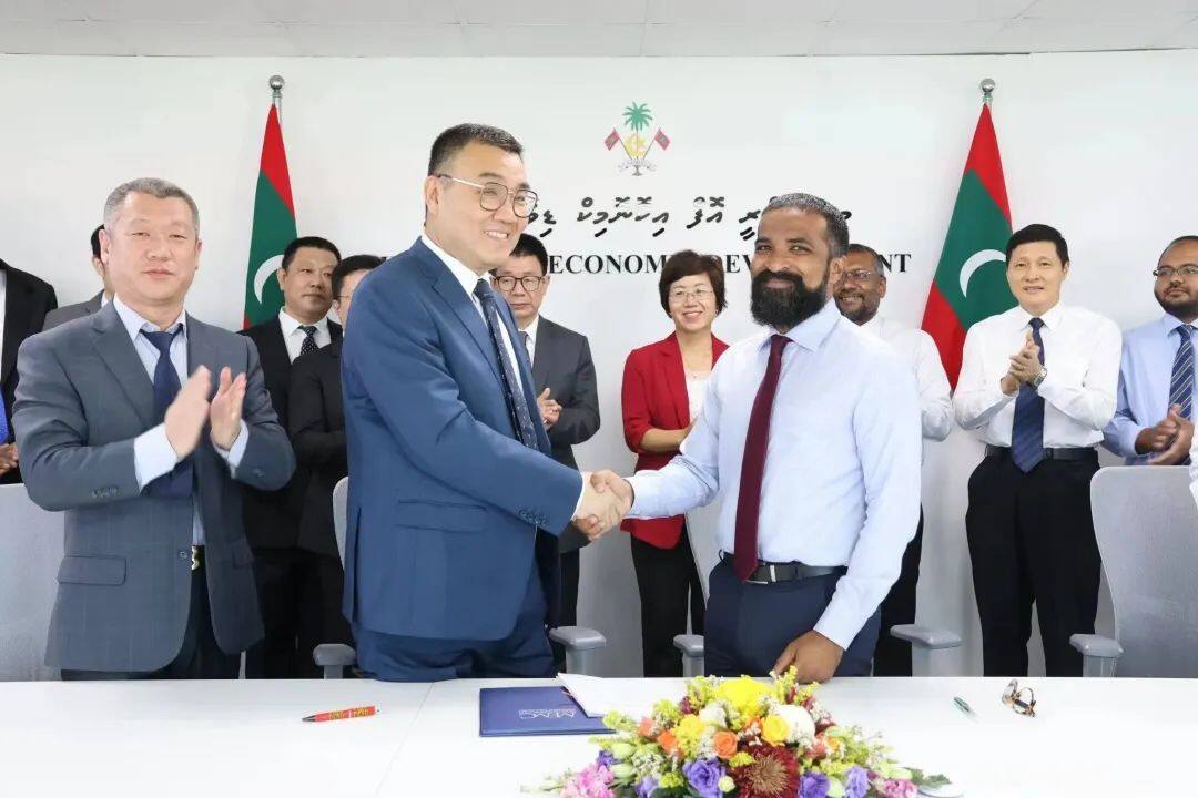 马尔代夫经济部长Fayyaz Ismail、财政部长Ibrahim Ameer、中国驻马尔代夫大使王立新、使馆经商参赞王其辉、中国信保第一营业部总经理郑忠平以及中国银行科伦坡分行业务发展部总经理唐鑫出席见证签约。马尔代夫国家基金公司首席财务官,中国信保第一营业部和中国银行金融部相关领导,中国电工副总经理金辉、第五事业部和第一区域部负责人参加了签约仪式。关键词:一带一路新闻、一带一路工程、海外工程新闻