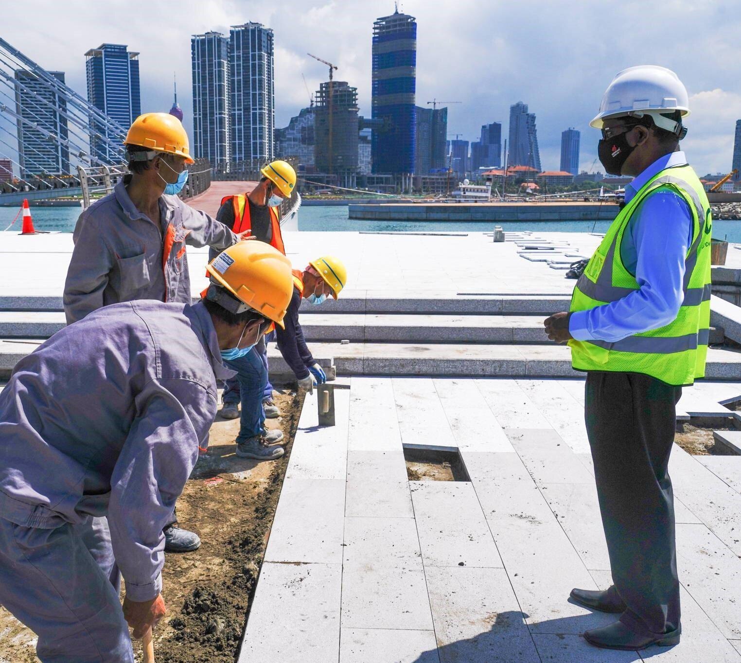 在斯里兰卡科伦坡港口城,工程师桑吉瓦在施工现场检查