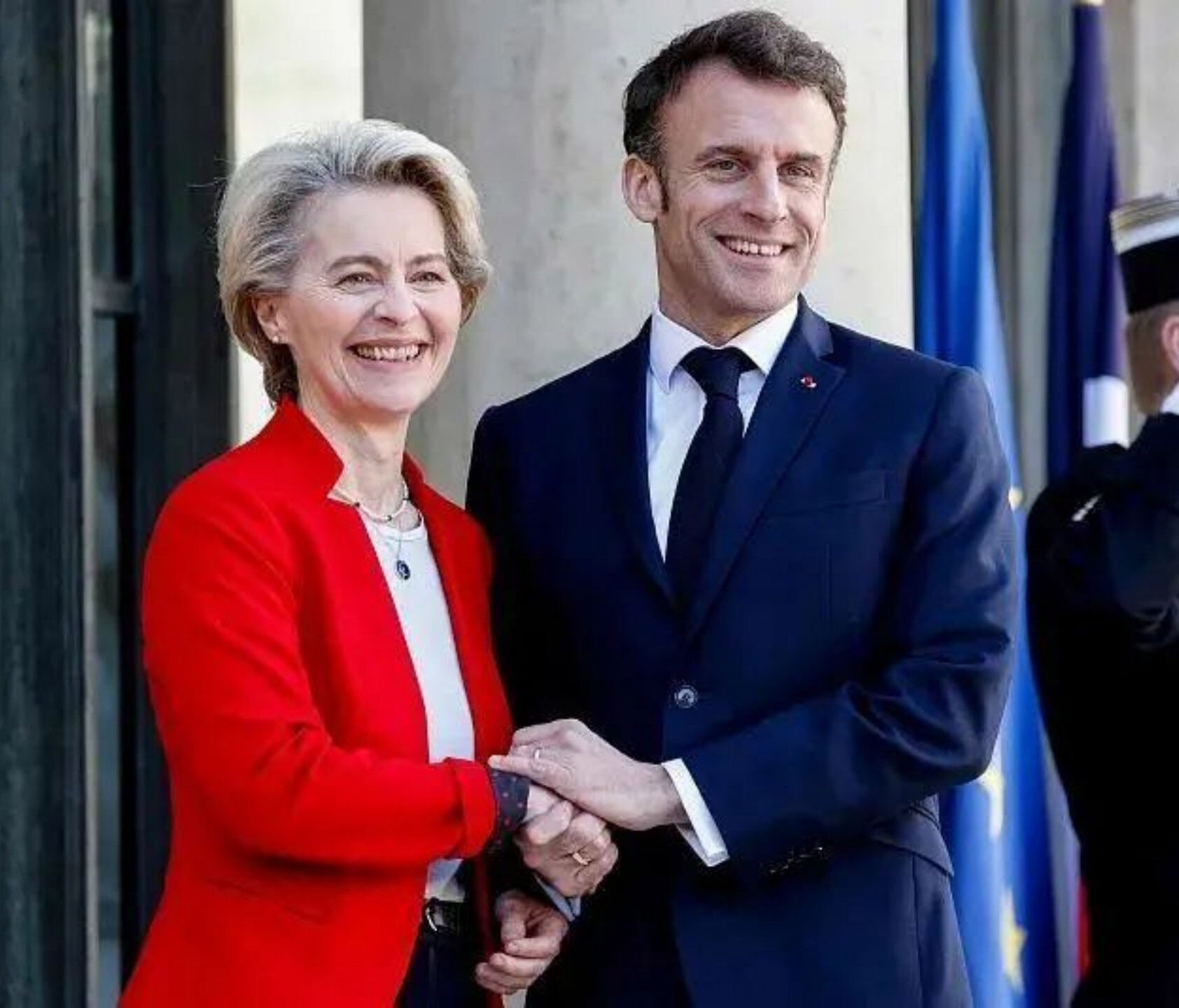 2023年4月3日,马克龙在爱丽舍宫与冯德莱恩会晤