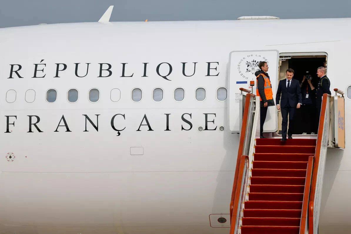 2023年4月5日下午,法国总统马克龙乘坐总统专机抵达北京首都机场