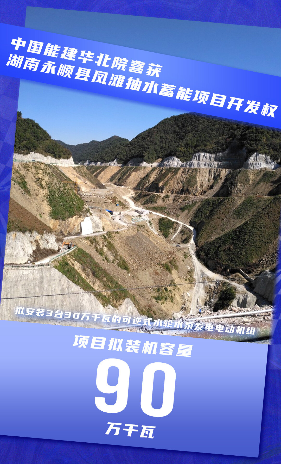 永顺县凤滩抽水蓄能电站项目是湘西州唯一纳入国家抽水蓄能中长期发展规划(2021-2035年)的中大型抽水蓄能项目,也是湘西州“十四五”期间重点实施项目和最大的单体工程。项目拟装机容量90万千瓦,拟安装3台30万千瓦的可逆式水轮水泵发电电动机组。项目具备交通便利、地理位置优越、水源充足、建设条件优良、淹没损失小、距高比指标好等6大优点。