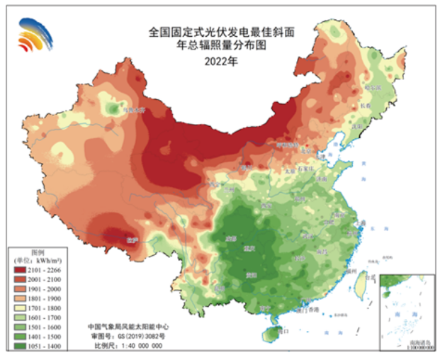2022年,全国平均年水平面总辐照量约1563.4千瓦时/平方米。为近30年最高值,与近30年(1992至2021年)平均值相比偏大3%,较近10年平均值偏大3.6%,较2021年偏大4.7%。全国平均光伏发电年最佳斜面总辐照量约1815.8千瓦时/平方米,较近30年偏大2.3%,较近10年偏大2.9%,较2021年偏大3.8%。