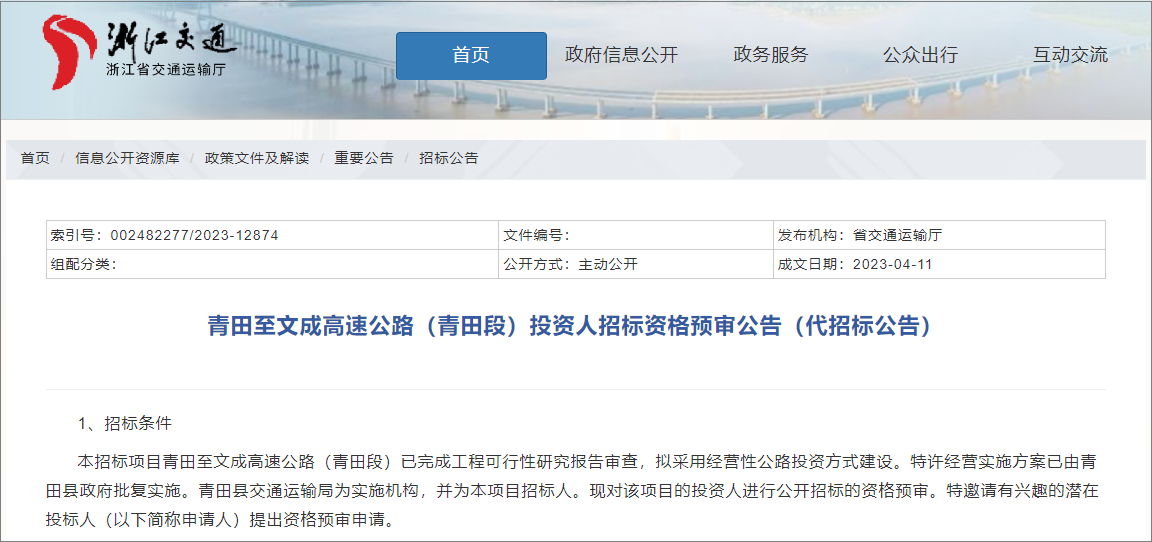 2023年4月11日,浙江省交通运输厅发布了青田至文成高速公路(青田段)投资人招标资格预审公告,该项目所属行业公路,项目估算总投资约80.67亿元,建安费约55.6亿元。