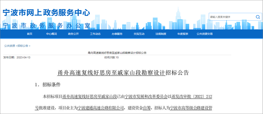 2023年4月13日,宁波市网上政务服务中心发布了甬舟高速复线好思房至戚家山段勘察设计招标公告,该项目所属行业公路,招标人为宁波市高等级公路建设管理中心,项目投资估算金额约49.40亿元,其中建安费约25.88亿元。