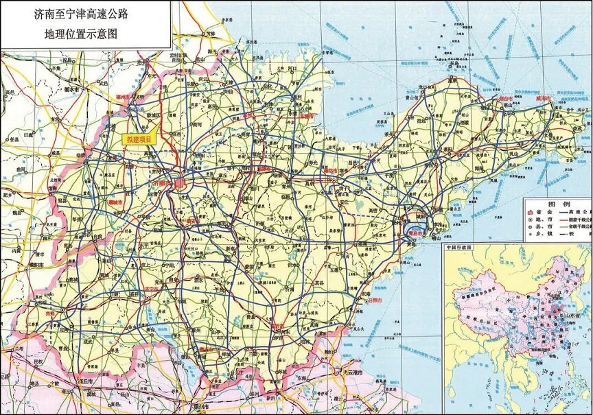The route of Jinan-Ningjin Expressway starts from Biaobaisi Town, Qihe County, Dezhou City, and connects with G2001 Jinan Ring Expressway at the starting point, intersects with G20 Qingyin Expressway and sets up Biaobaisi Junction Interconnection, passing through the northern part of Tianqiao District, Jinan City, Jinan New and Old Kinetic Energy Change the starting area, Qihe County, Linyi County, Lingcheng District, Ningjin County and other counties and cities in Dezhou City, and end at the northeast of Qianliu Village, Baodian Town, Ningjin County, Dezhou City, Shandong Province, and set up Ningjin West Interchange to connect to G339 National Highway. The total length of the route is 94.886 kilometers, with 9 bridges of 3566 meters, 30 bridges of 1971.48 meters, 6 small bridges of 205 meters, 173 culverts, 11 interchanges, 25 separate interchanges of 2640.18 meters, and 74 passage bridges. 2 service areas, 7 ramp toll stations, 2 maintenance work areas, and 1 monitoring and communication sub-center. The whole line adopts the standard construction of two-way six-lane expressway, with a design speed of 120 km/h and a roadbed width of 34.5 meters. The planned construction period is 36 months, and the defect liability period is 24 months.