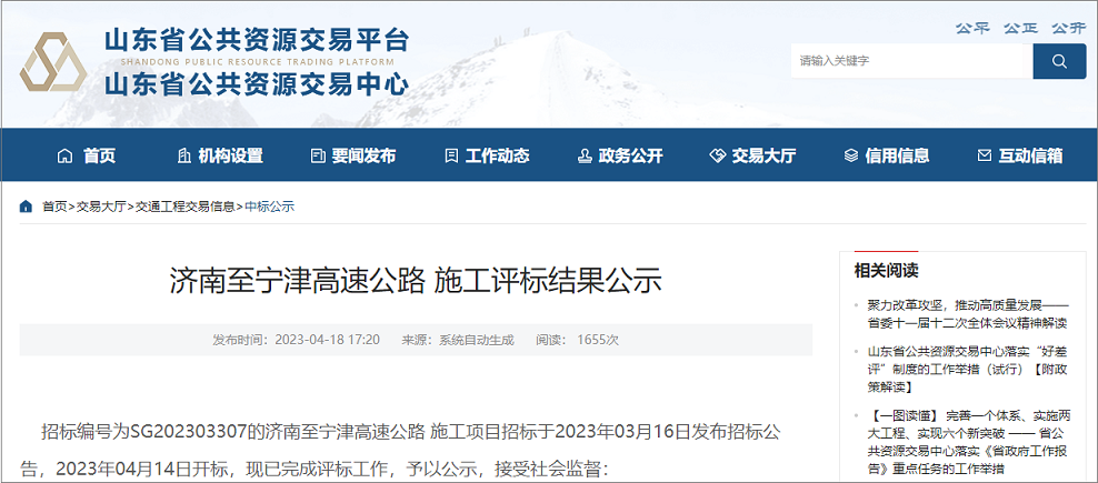 On April 18, 2023, the Public Resources Trading Center of Shandong Province released the announcement of the bid evaluation results for the construction of the Jinan-Ningjin Expressway. China Communications Road Construction won the bids respectively.