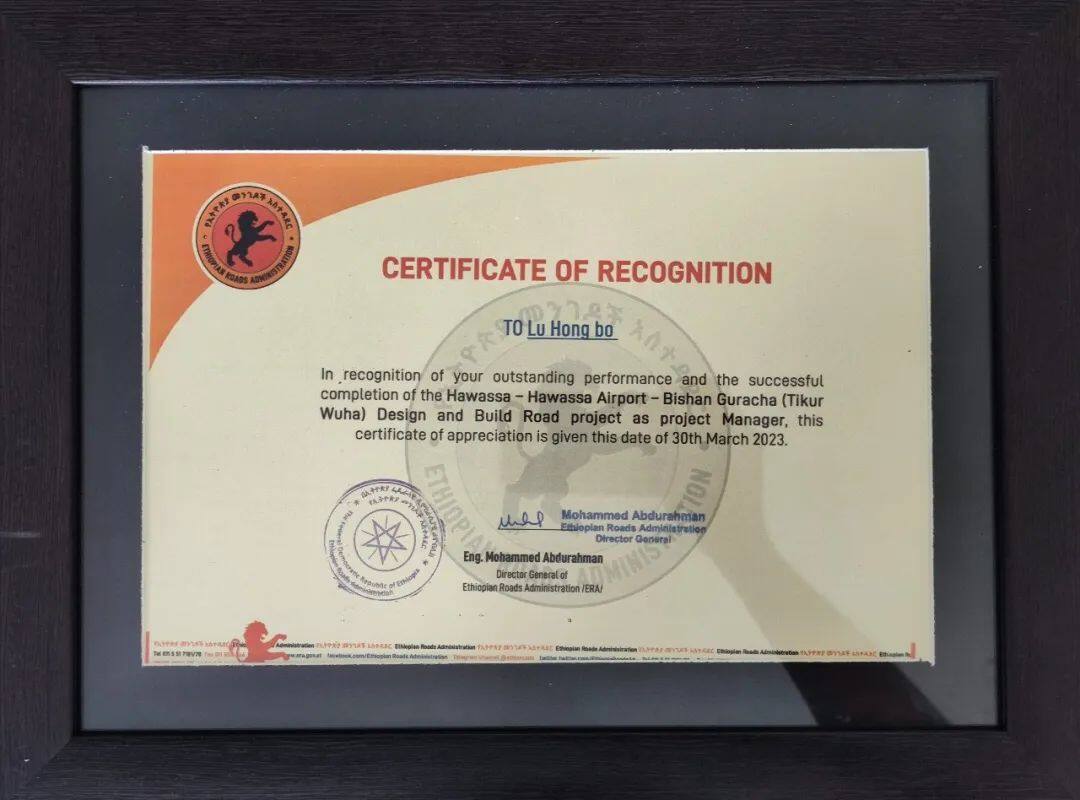 验收完毕后,埃塞俄比亚公路局局长默罕默德亲自签发了认证书,对项目经理鲁洪波在项目建设过程中的优异表现给予表彰。(转载请注明见道网www.seetao.com)见道网工程栏目编辑/马雪