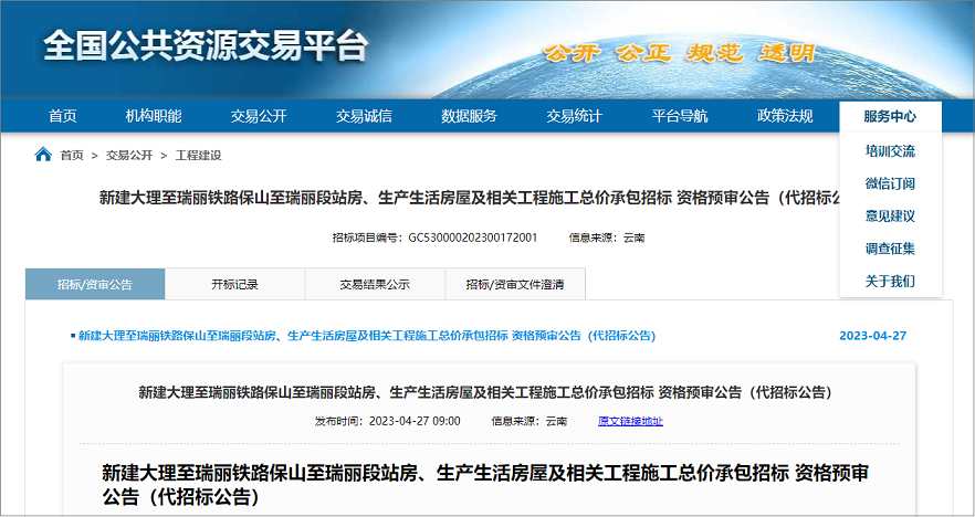 2023年4月27日,《新建大理至瑞丽铁路保山至瑞丽段站房、生产生活房屋及相关工程施工总价承包招标资格预审公告》发布。大瑞铁路保山至瑞丽段7座新建站房工程即将正式开工建设,计划于2026年12月底竣工。
