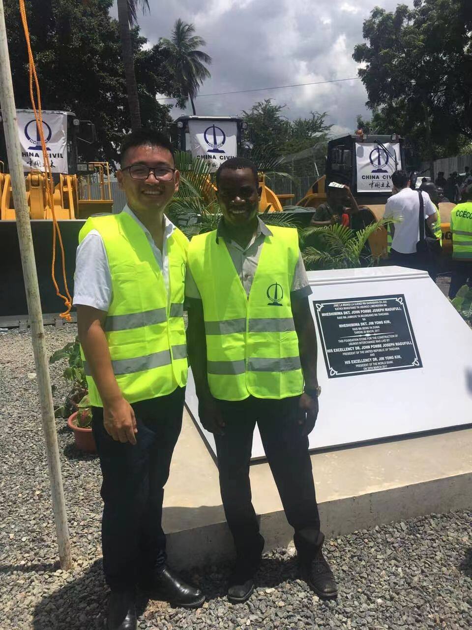 王超在达累斯萨拉姆市乌本戈立交桥项目奠基仪式上同当地工人合影