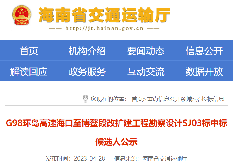 On April 28, 2023, the Hainan Provincial Public Resources Trading Center issued an announcement on winning the bid for the survey and design of the reconstruction and expansion project of the Haikou-Boao section of the G98 Ring Expressway. The construction and installation fee is 8.76 billion yuan. The construction period is 3.5 years.