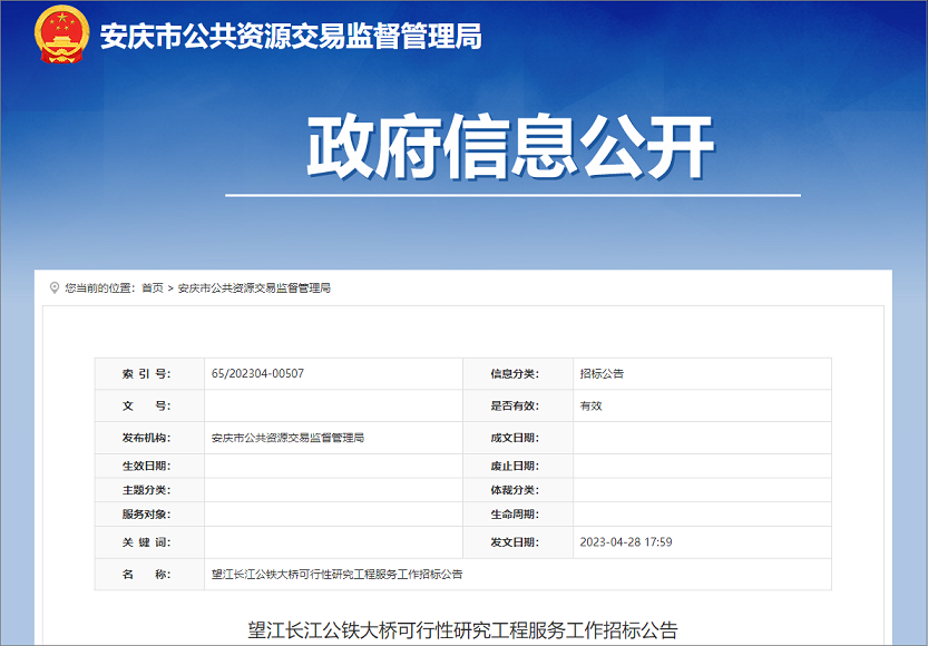 据见道网记者获悉,2023年4月28日,安徽望江长江公铁大桥可行性研究工程服务工作招标公告在安庆市公共资源交易中心发布,招标人为望江县人民政府、东至县人民政府。本项目的总投资约82.5亿元,其中工程建安费约64.7亿元。