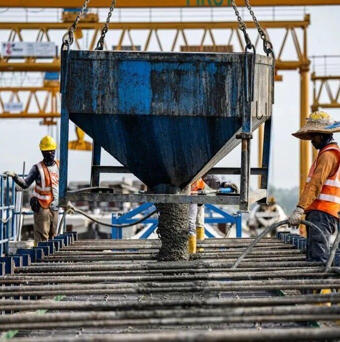4月26日,工人在马来西亚吉兰丹州的马东铁项目一分部5号桥建设现场工作