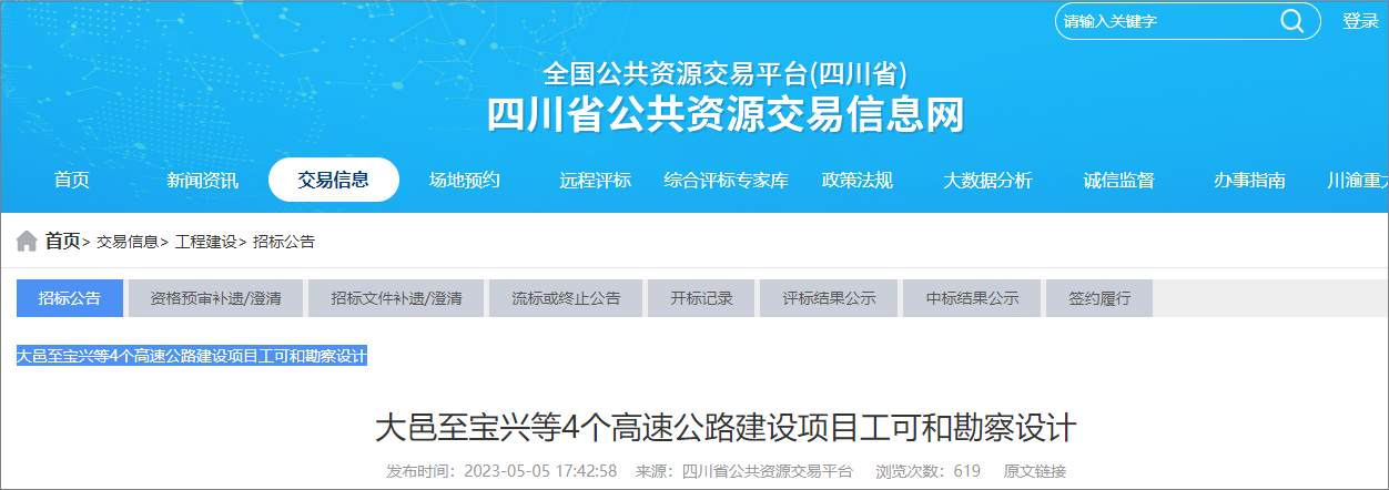 On May 5, 2023, the Sichuan Provincial Public Resources Transaction Information Network released the Dayi-Baoxing Expressway, G65 Baomao Expressway Linshui-Chongqing Boundary Section Expansion Project, S26 Dazhou-Wanzhou Expressway, Panzhihua Ring Expressway 4 Announcement of bidding for construction permit and survey and design of expressway construction projects.
