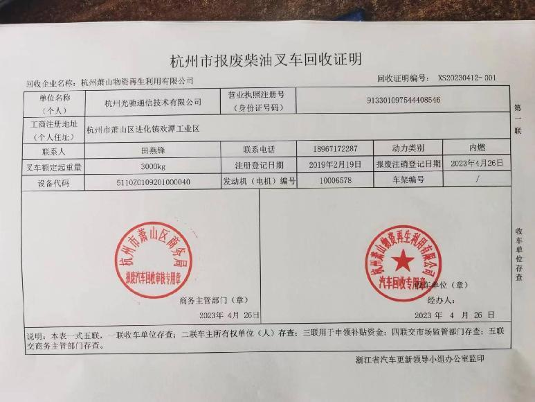 杭州市报废柴油叉车回收证明