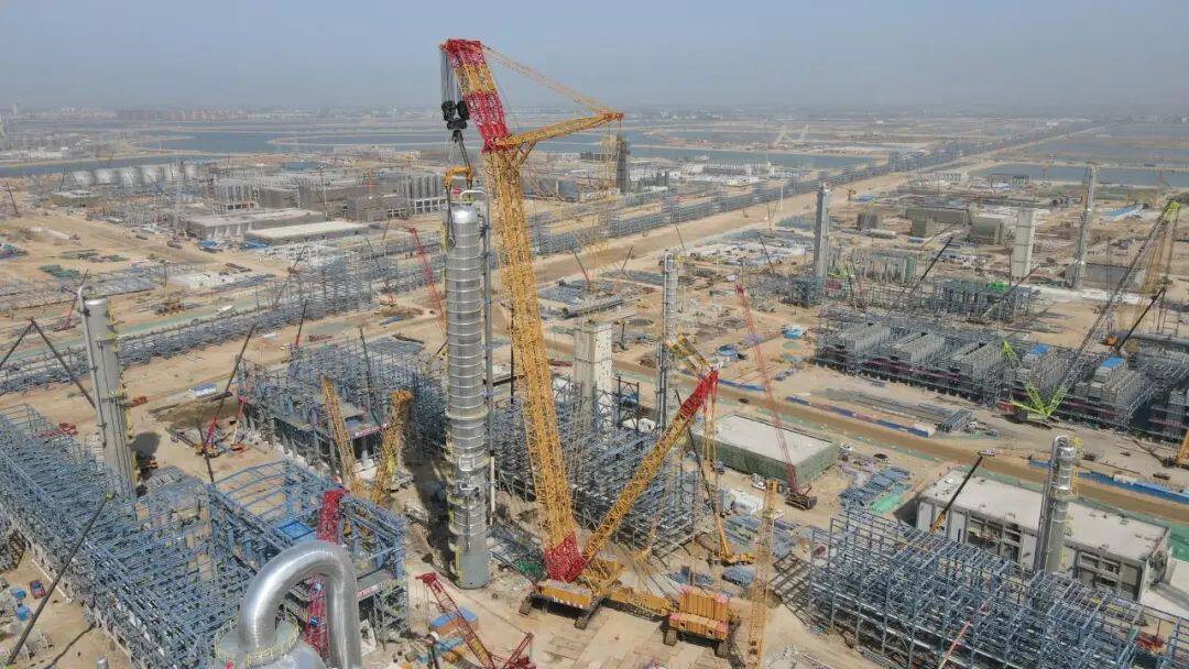 The hoisted ethylene rectification tower has a diameter of 7.3 meters, a height of 93.7 meters, and a total weight of 1,680 tons. In order to ensure the smooth progress of the hoisting task, the project hoisting team coordinated various mechanical resources in advance, reasonably arranged construction elements, worked overtime to collect relevant data, determined the hoisting plan, and organized construction personnel to carry out hoisting simulation and other work. After the ethylene distillation tower was transported from the wharf yard to the construction site as a whole, the project department quickly organized the construction personnel to complete the dressing work such as the ladder platform of the tower body, the pipeline attached to the tower, and electrical work, so as to prepare for the overall hoisting of the equipment. At 12:45 noon on May 9, the hoisting officially started. This time, the single main engine hoisting delivery method was adopted, with a 4000t crawler crane as the main hoist and an 800t crawler crane as the auxiliary tail. After more than three hours of lifting and turning with the joint efforts of the two vehicles, the equipment was finally placed on the foundation at 4:30 p.m.