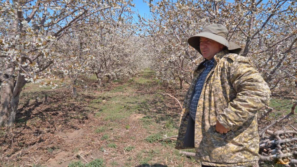 在吉尔吉斯斯坦卡拉奥伊村,村民叶夫根尼·雅科夫列夫站在自家栽种的果树前
