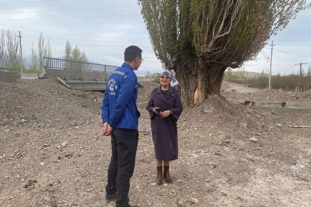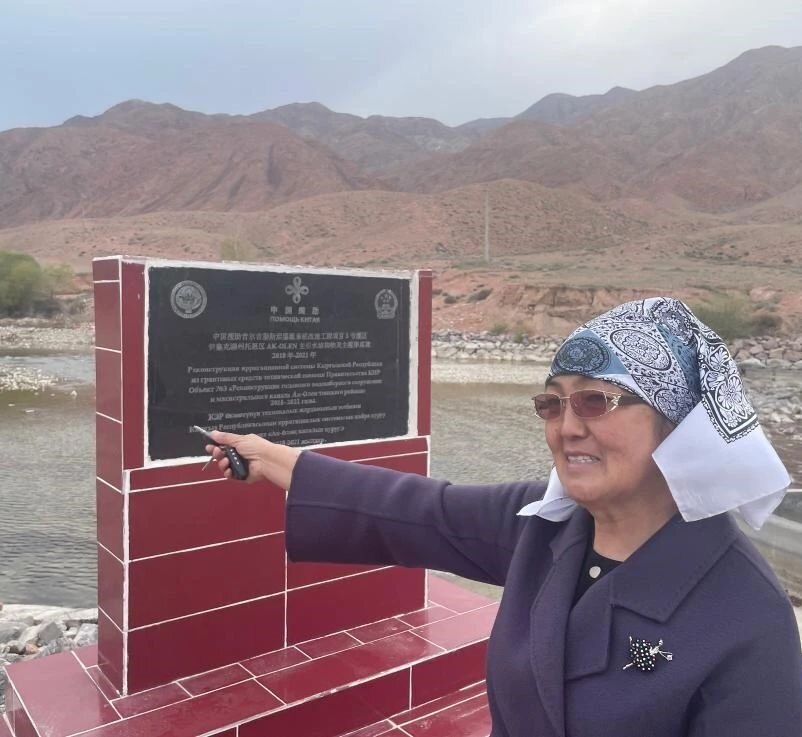 阿克奥隆村前村委会主任玛伊拉姆·卡迪拉列娃站在中国援吉灌溉系统改造工程的纪念碑旁