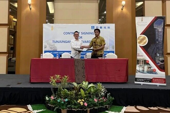 2023年5月11日,中建八局印尼房建市场再传佳讯,Tunjungan Boulevard高端公寓项目签约仪式在印尼三宝垄举行。印尼公司总经理李杰,副总经理赵业保及业主方PT. Alam Mas Indonesia代表出席签约仪式。