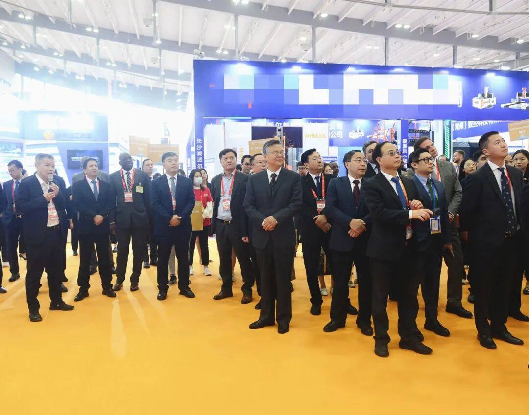 湖南省委常委、常务副省长李殿勋带领驻华使领馆代表参观铁建重工展台,铁建重工党委副书记、董事、总经理赵晖,党委副书记、董事、工会主席贺勇军陪同讲解
