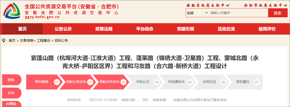 2023年5月12日,安徽合肥公共资源交易中心发布了合肥紫蓬山路工程、蓬莱路工程、蒙城北路工程和习友路工程设计招标公告,该项目所属行业公路,招标人合肥市重点工程建设管理局,项目总投资约66.2亿元。