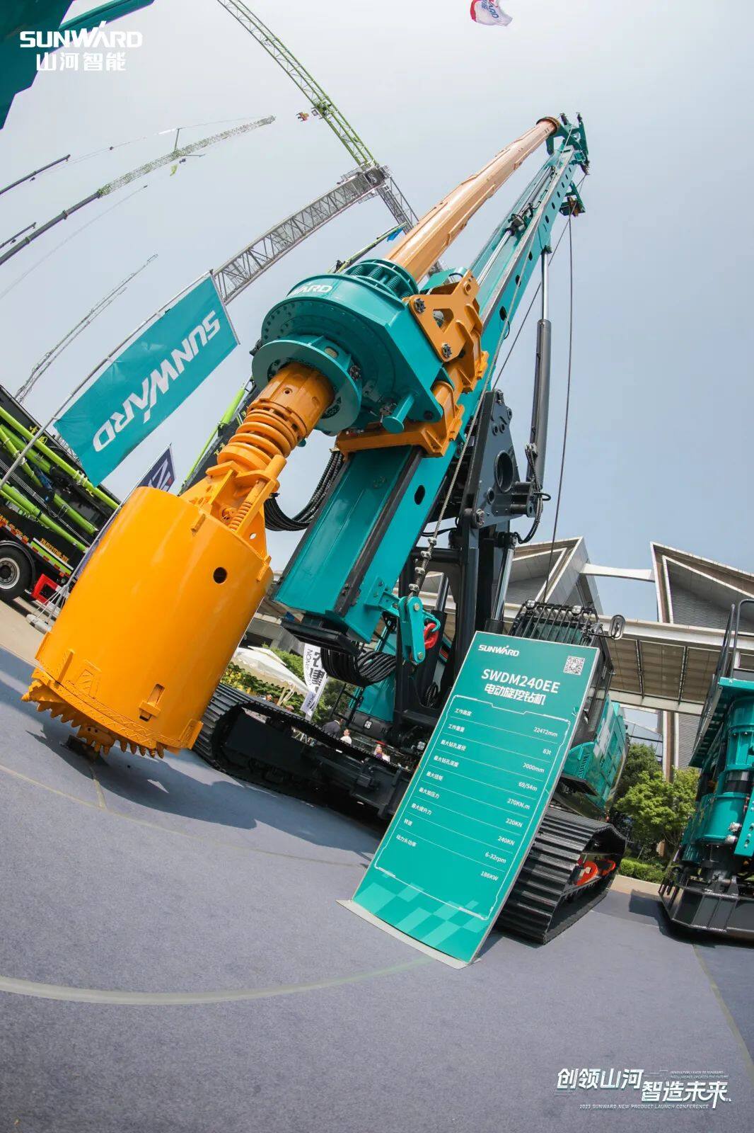 SWDM240EE增程旋挖钻机主要施工负载动力头和主卷扬采用电机直驱,纯电模式能量利用效率较传统柴油版旋挖高50%以上,钻杆下放时可自动进行回收充电;同时,纯电模式较传统燃油钻机施工最佳工况可节约75%,可自动切换插电、电池和增程模式,高效便捷,绿色环保!在室外展区,这款标志性的新产品吸引了不少专业客商的关注。