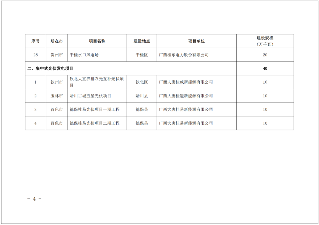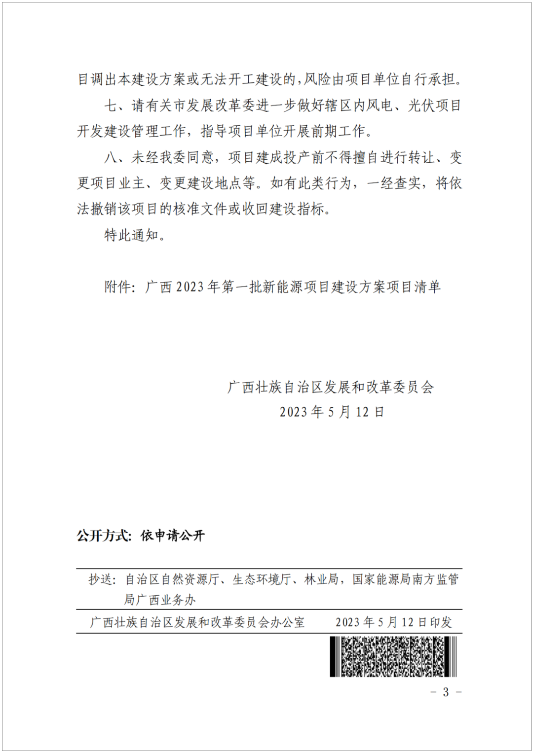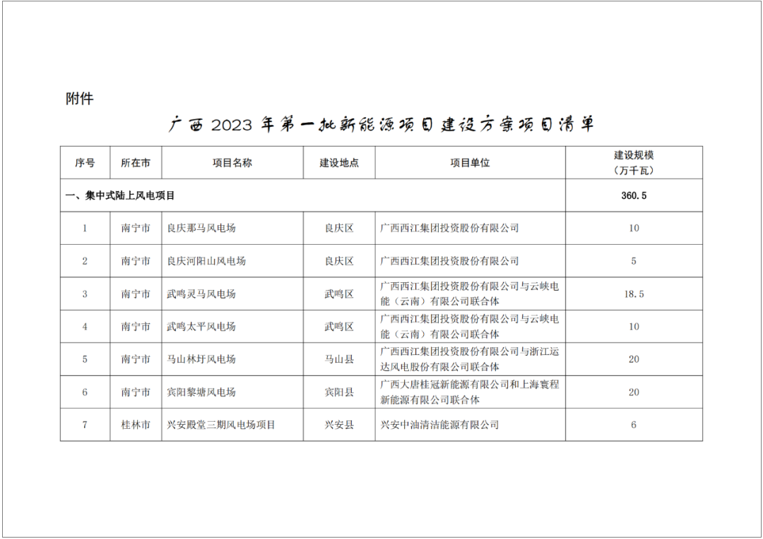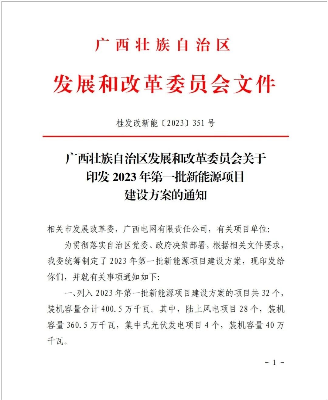 2023年5月12日,广西发改委印发了2023年第一批新能源项目建设方案的通知,通知显示,广西列入2023年第一批新能源项目建设方案的项目共32个,装机容量合计400.5万千瓦。其中,陆上风电项目28个,装机容量360.5万千瓦,集中式光伏发电项目4个,装机容量40万千瓦。
