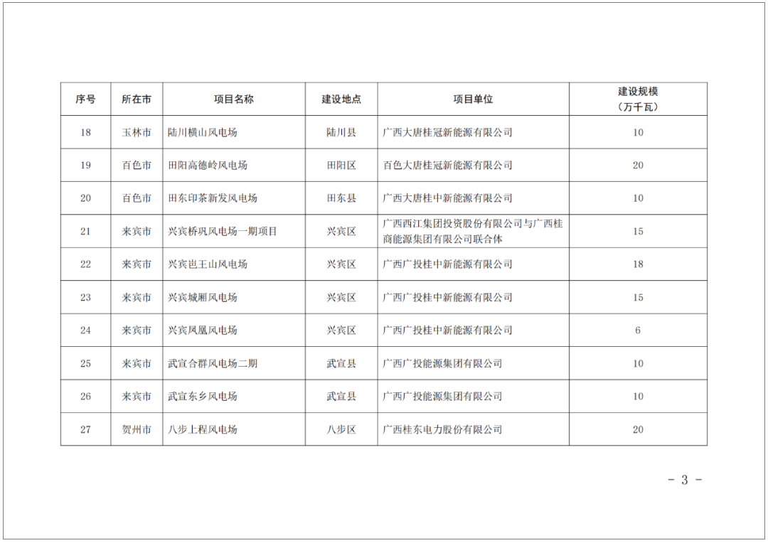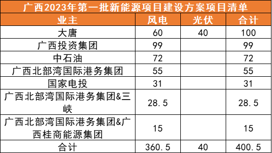 根据广西2023年第一批新能源项目建设方案项目清单,统计业主发现,大唐桂冠电力拿到了100万千瓦的指标,其中风电60万千瓦、光伏40万千瓦;广西投资集团风电99万千瓦、中石油风电72万千瓦、广西北部湾国际港务集团风电55万千瓦、国家电投风电31万千瓦。