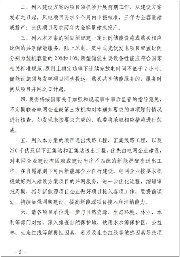 配储方面,列入方案的项目须配建一定比例储能设施或购买相应比例的共享储能服务。陆上风电、集中式光伏发电项目配置比例分别为装机容量的20%和10%。新型储能主要设备性能应符合国家相关标准规范,原则上额定功率下连续充放电时间不低于2小时。储能设施须与发电项目同步投运,购买共享储能服务的,服务时间从项目并网之日计起。经过光伏們计算,此次配储能规模为1.522GWh。