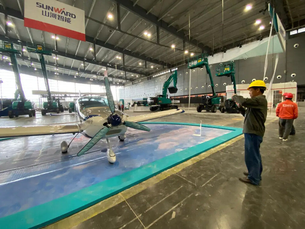 “拍段视频发朋友圈。”正在E2馆布展的工人纷纷拿出手机对着一架直升机进行拍摄。记者看到,这是一台山河智能的轻型运动飞机。据了解,此次山河智能将携自主研发的地下工程装备、挖掘机械、高空机械、应急救援装备、破碎筛分设备、通航设备等6大类超50款高端、智能、绿色装备亮相展会。