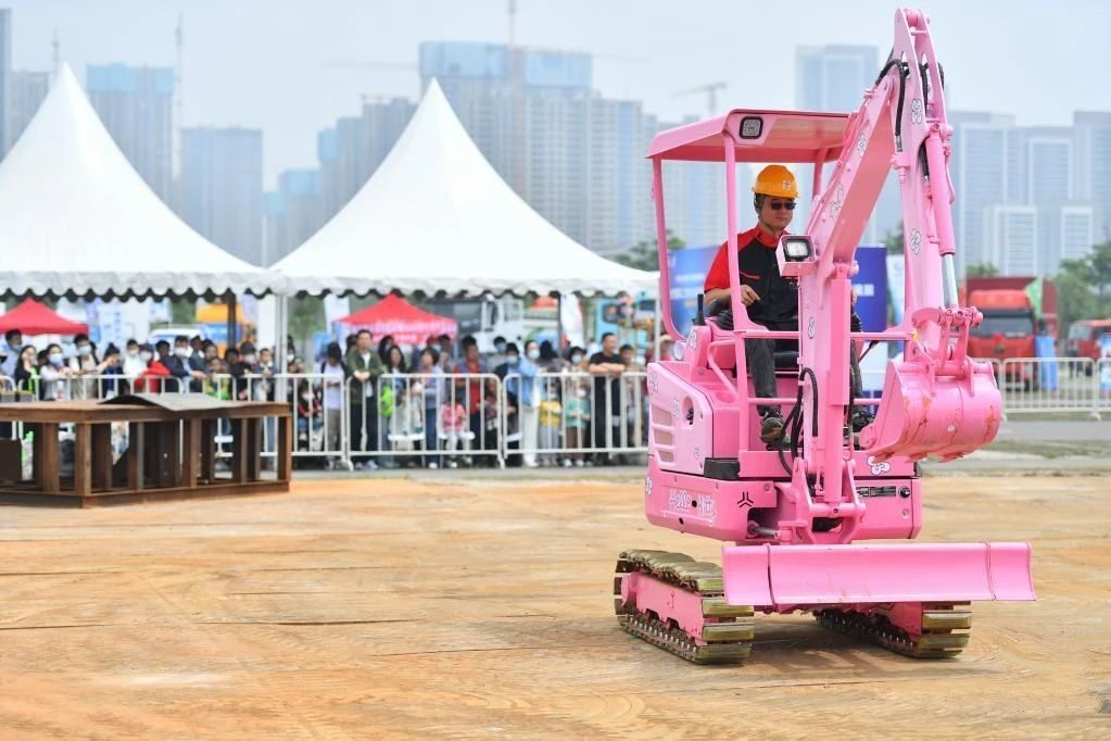 5月12日,观众在长沙国际工程机械展览会室外展区观看微型挖掘机表演