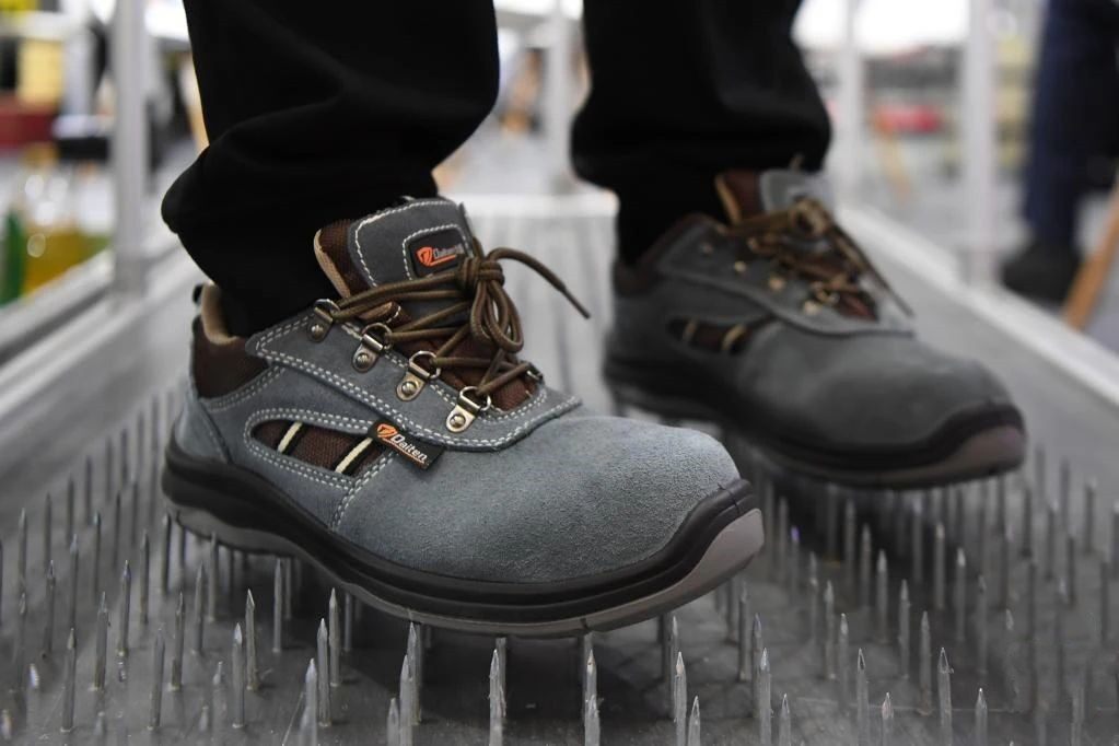 5月12日,参展商在长沙国际工程机械展览会现场展示一双防刺穿劳保鞋