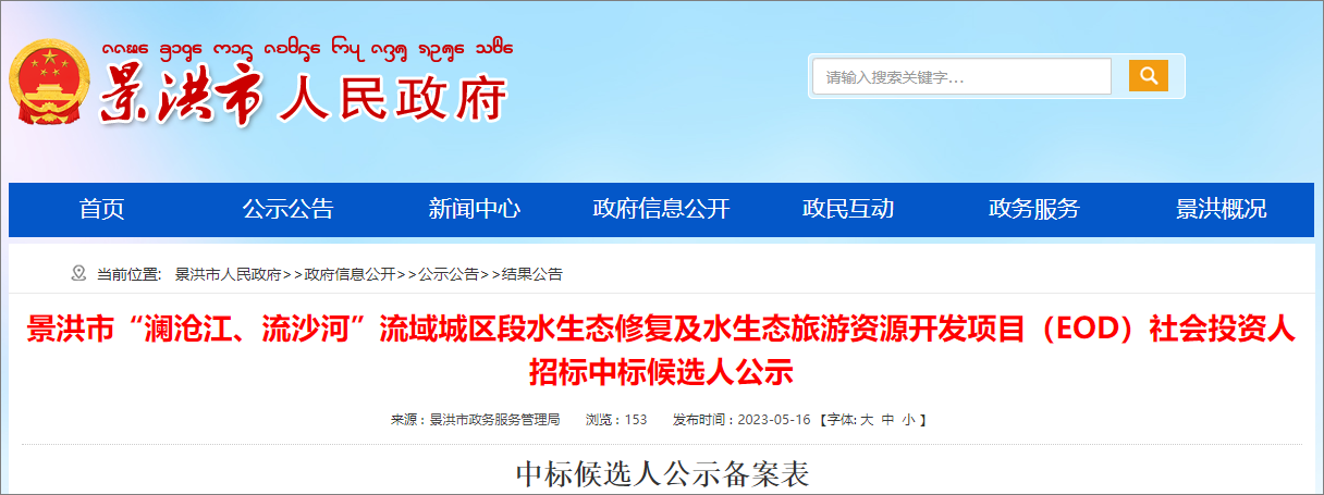 2023年5月16日,景洪市人民政府发布了景洪市“澜沧江、流沙河”流域城区段水生态修复及水生态旅游资源开发项目社会投资人招标项目发布中标候选人公示。该项目由中铁建发展集团、中铁十六局等5家单位中标,标段合同估算价29.68亿元。