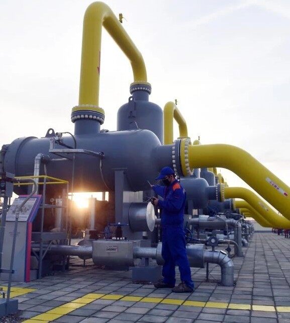 工作人员在中亚天然气管道霍尔果斯计量站进行巡检