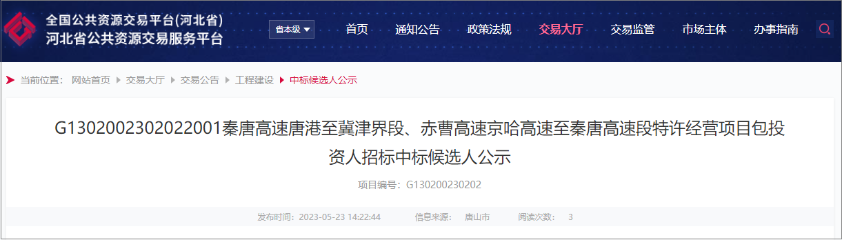 2023年5月23日,河北省交通运输厅发布了秦唐高速唐港至冀津界段、赤曹高速京哈高速至秦唐高速段特许经营项目包投资人招标中标候选人公示,该项目由中国铁建昆仑投资集团有限公司、中铁十六局集团有限公司等6家单位中标,项目总投资约113.8亿元。