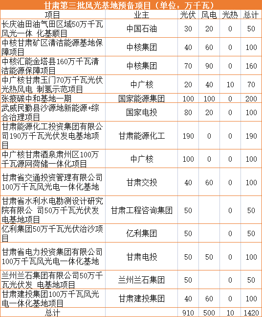 世界能源格局发生重要变化,可再生能源产业蓬勃发展。据见道网获悉,甘肃下发第三批风光大基地预备项目清单,规模总计14.2GW,其中光伏9.1GW,风电5GW。据了解,甘肃第三批风光基地均为预备项目,均采取就地消纳。预备项目在项目业主自愿签订项目利用率等承诺书后,允许开工建设,利用率达到该地区正常水平后,转为正式项目。